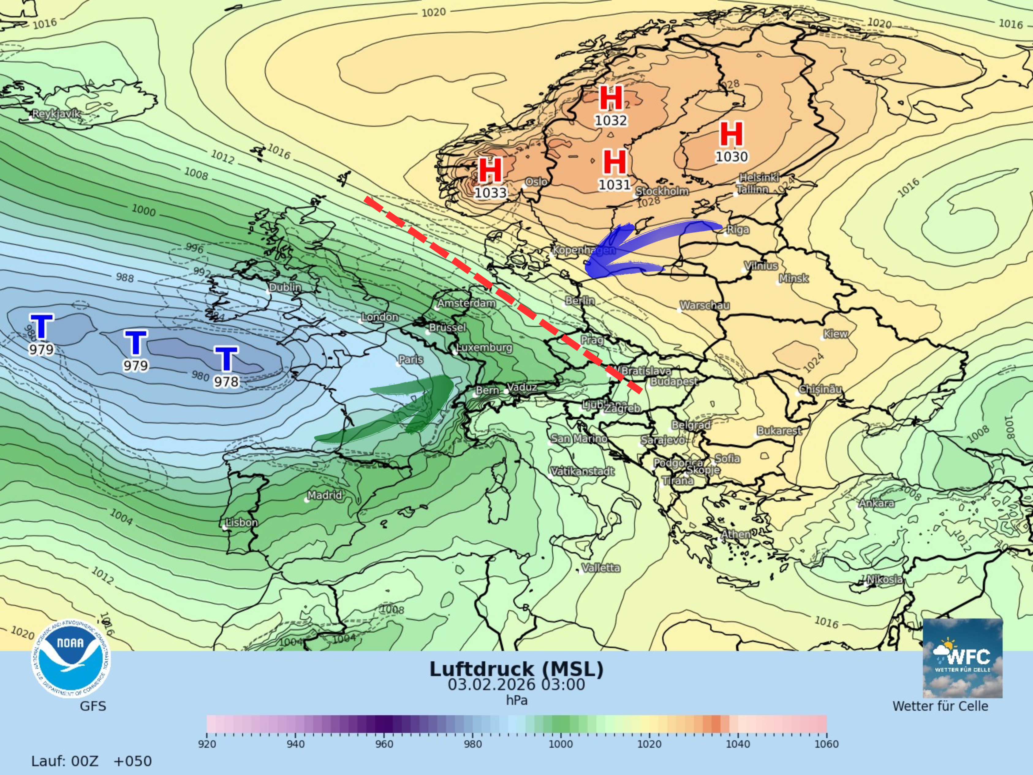 Hier das die MSLP (Luftdruck auf Meereshöhe) oder auch Bodendruck genannt