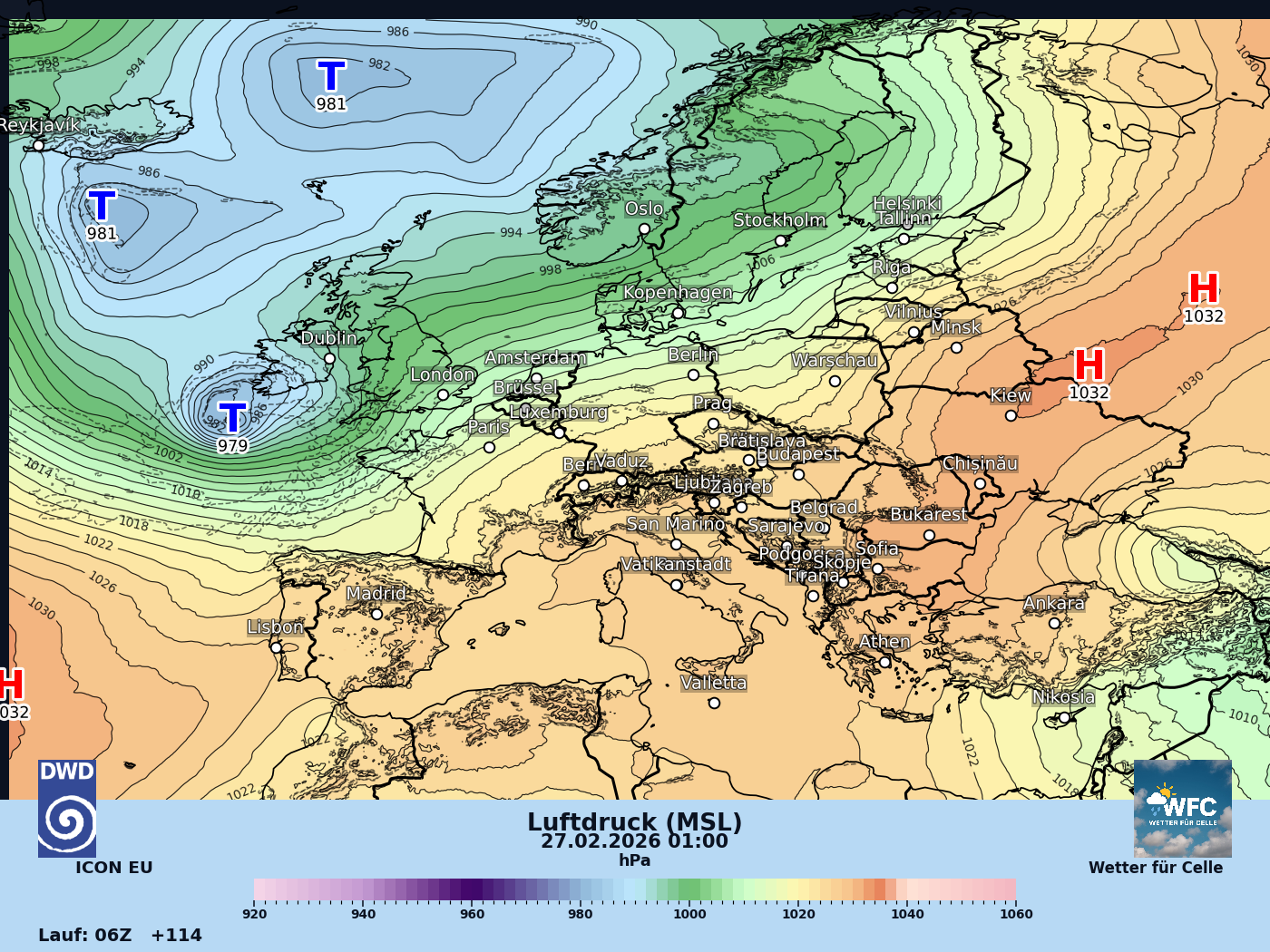Das Islandtief ist sehr stark ausgeprägt und unten wo die H sind bzw auch über Nordosteuropa, das sind dann die Hochdruckgebiete die sich alle verbunden haben.